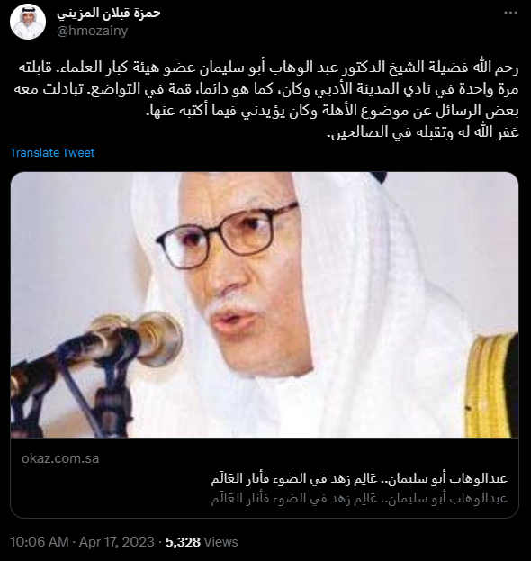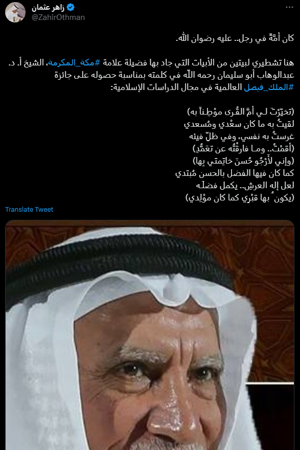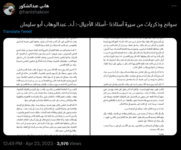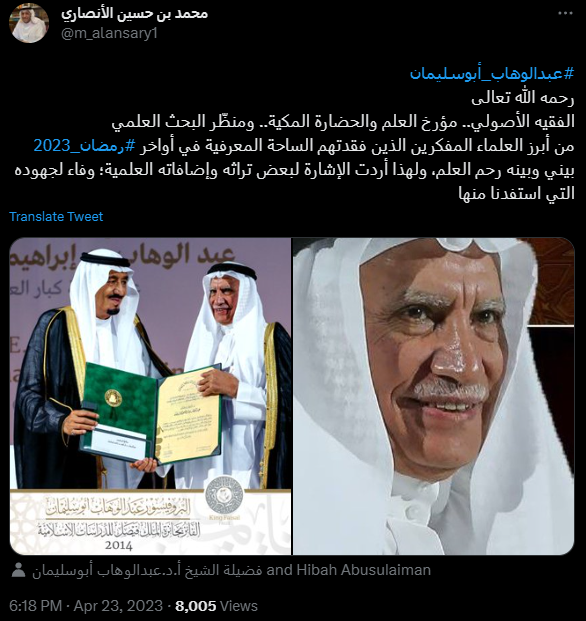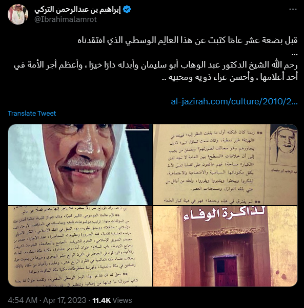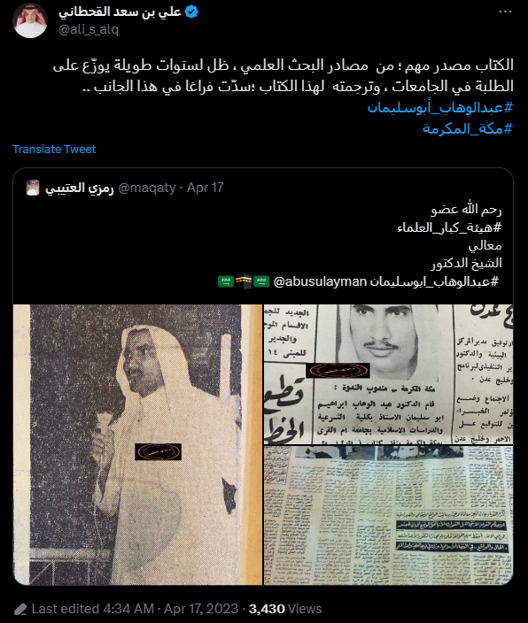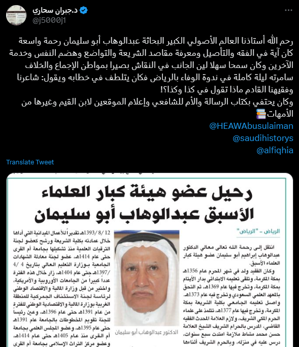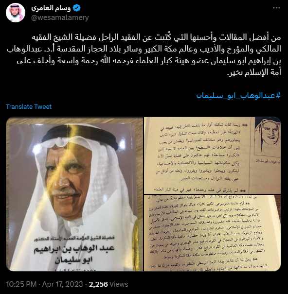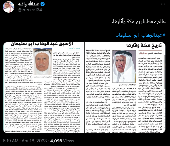 من أفضل المقالات وأحسنها التي كُتبت عن الفقيد الراحل فضيلة الشيخ الفقيه المالكي والمؤرخ والأديب وعالم مكة الكبير وسائر بلاد الحجاز المقدسة أ.د. عبدالوهاب بن إبراهيم ابو سليمان عضو هيئة كبار العلماء فرحمه الله رحمة واسعة وأخلف على أمة الإسلام بخير. #عبدالوهاب_ابو_سليمان