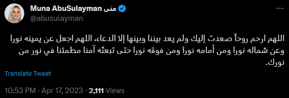 اللهم ارحم روحاً صعدت إليك ولم يعد بيننا وبينها إلا الدعاء، اللهم اجعل عن يمينه نورا وعن شماله نورا ومن أمامه نورا ومن فوقه نورا حتى تبعثه آمنا مطمئنا في نور من نورك.