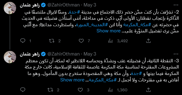 – النقطة الثانية، أن فضيلته عتب وبشدَّة وبحماسه اللانظير له لمكة، أن تكون معظم المشروعات المقترحة لمناسبة مكة المكرمة عاصمة للثقافة الإسلامية، كانت خارج مكة المكرمة فيما بينها و #جدة، وأن مكة وهي المقصودة ستخرج بدون المأمول. وهو ما أفاض به في مقترحات ولا أجمل لـ #مكة_المكرمة وتاريخها وتراثها، تم تضمينها في المحضر الذي أشار إليه سمو الأمير في مقالته. جزى الله سمو الأمير خيرًا، ورضي عن فضيلة الشيخ الأستاذ الدكتور #عبدالوهاب_أبو_سليمان، وأرضاه.