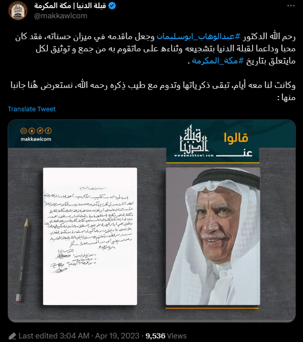 رحم الله الدكتور #عبدالوهاب_ابوسليمان وجعل ماقدمه في ميزان حسناته، فقد كان محبا وداعما لقبلة الدنيا بتشجيعه وثناءه على ماتقوم به من جمع و توثيق لكل مايتعلق بتاريخ #مكة_المكرمة . وكانت لنا معه أيام، تبقى ذكرياتها وتدوم مع طيب ذِكره رحمه الله، نستعرض هُنا جانبا منها :