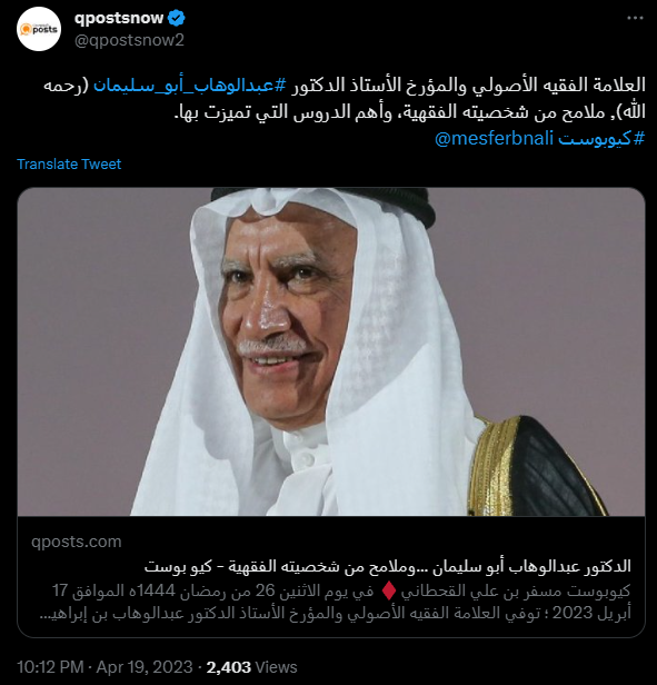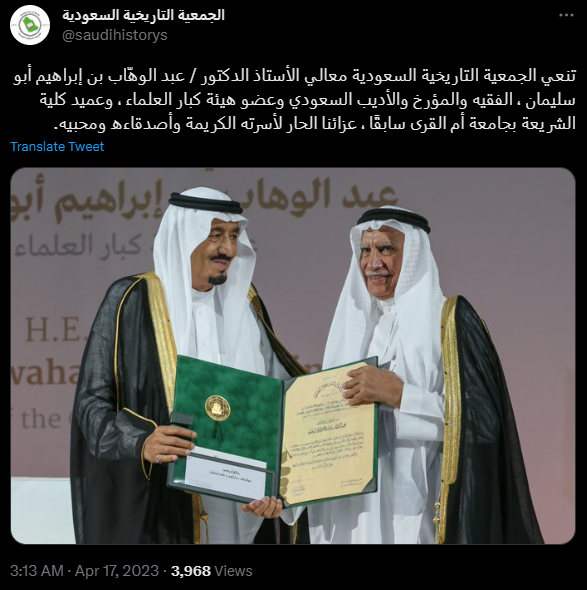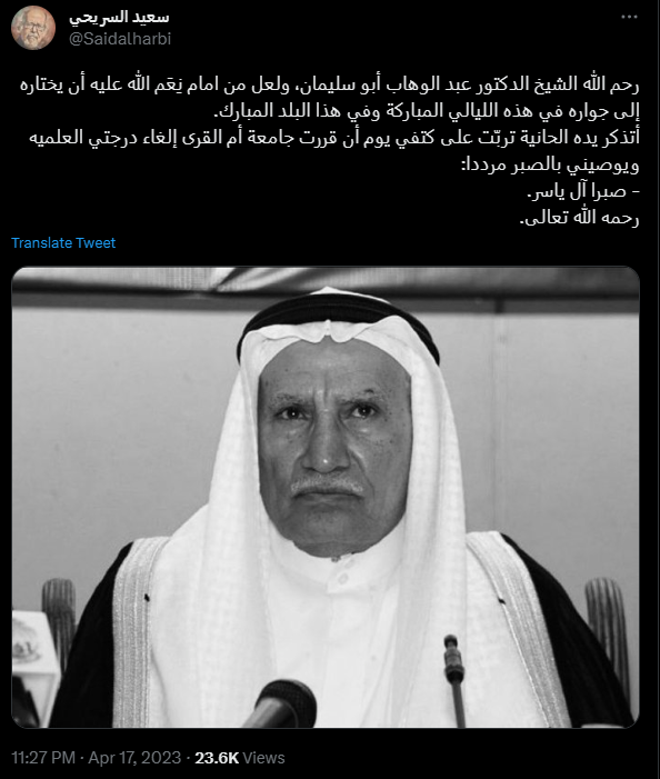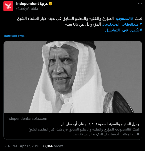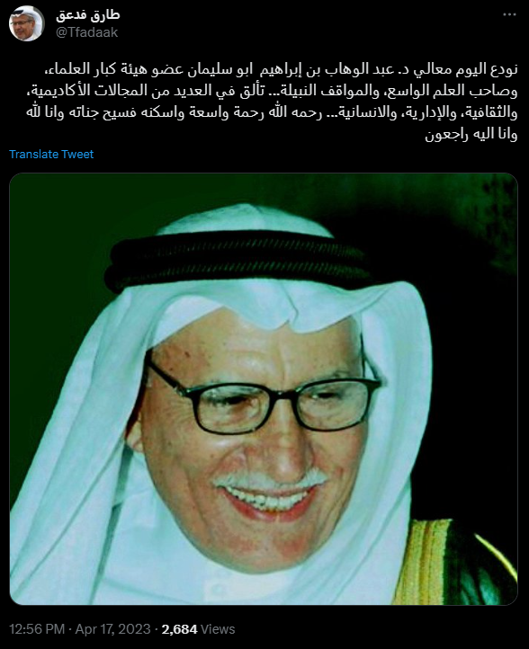 نعت #السعودية المؤرخ والفقيه والعضو السابق في هيئة كبار العلماء الشيخ #عبدالوهاب_أبوسليمان الذي رحل عن 86 سنة #نكمن_في_التفاصيل