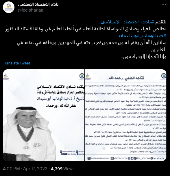 يتقدم #نادي_الاقتصاد_الإسلامي بخالص العزاء وصادق المواساة لطلبة العلم في أنحاء العالم في وفاة الاستاذ الدكتور #عبدالوهاب_أبوسليمان سائلين الله أن يغفر له ويرحمه ويرفع درجته في المهديين ويخلفه في عقبه في الغابرين وإنا لله وإنا إليه راجعون.