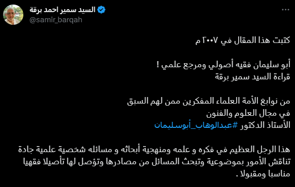 كتبت هذا المقال في ٢٠٠٧ م أبو سليمان فقيه أصولي ومرجع علمي ! قراءة السيد سمير برقة من نوابغ الأمة العلماء المفكرين ممن لهم السبق في مجال العلوم والفنون الأستاذ الدكتور #عبدالوهاب_أبوسليمان هذا الرجل العظيم في فكره و علمه ومنهجية أبحاثه و مسائله شخصية علمية جادة تناقش الأمور بموضوعية وتبحث المسائل من مصادرها وتؤصل لها تأصيلا فقهيا مناسبا ومقبولا . لدى فضيلته الكفاءة العلمية التي تؤهله لفهم النصوص وسبر غورها وإدراك معانيها مع القدرة على الاستنباط واستخراج المعاني والأحكام والفوائد يمزج بين الأصالة الفقهية والتجديد فالفقه المقارن له فيه السبق العلمي واليد الراسخة والقلم المتمكن والفهم الحاذق له اجتهادا ت ومناقشات بطرحه العلمي وقالبه الفكري . فهو فقيه عصره وإمام وقته ومثقف كلماته وصانع مجده ومؤلف كتبه ومدقق مسائله وباحث أصوله وعارف مقاصده ومؤرخ زمانه وتلميذ شيوخه وشيخ تلاميذه . أجاد فأتقن وبرع فتفنن وجمع فأوعى تعرفه المراجع ويقصده الباحثون متخصص بالبحوث يناقش ولا يجادل يتواضع ولا يتفاخر يسند كل كلامه ويحسب لخطواته . في العلم لا يجامل أحدا ولا يتراخى عن طلبه وقته ثمين ومنظم وساعاته محسومة وخطواته محسوبة وكلماته معدودة ومعانيه كبيرة . قمة في التواضع عظمة في الأخلاق هكذا هم العلماء الأفذاذ والفقهاء الأحذاق. وعالمنا البحاثة الأصولي من هذه الثلة المباركة التي أنتجتهم مكة المكرمة فأنعم بهم وبأمثالهم وهنيئا لنا بهم وبعلمهم وفكرهم . ((نشرت في صحيفة عكاظ في عام ٢٠٠٧ م))