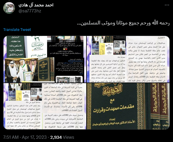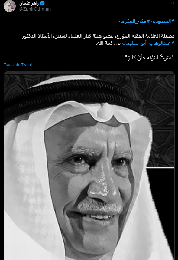 #السعودية #مكة_المكرمة فضيلة العلامة الفقيه المؤرِّخ، عضو هيئة كبار العلماء لسنين، الأستاذ الدكتور #عبدالوهاب_أبو_سليمان في ذمة الله. “يمُوتُ لِمَوْتِهِ خَلْقٌ كَثِيرُ.”