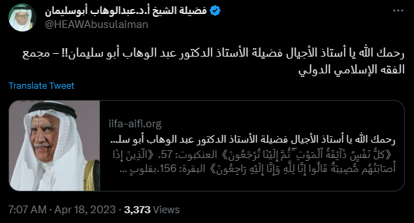 رحم الله أستاذنا العالم الأصولي الكبير البحاثة عبدالوهاب أبو سليمان رحمة واسعة كان آية في الفقه والتأصيل ومعرفة مقاصد الشريعة والتواضع وهضم النفس وخدمة الآخرين وكان سمحا سهلا لين الجانب في النقاش بصيرا بمواطن الإجماع والخلاف سامرته ليلة كاملة في ندوة الوفاء بالرياض فكان يتلطف في خطابه ويقول: شاعرنا وفقيهنا القادم ماذا تقول في كذا وكذا؟! وكان يحتفي بكتاب الرسالة والأم للشافعي وإعلام الموقعين لابن القيم وغيرها من الأمهات